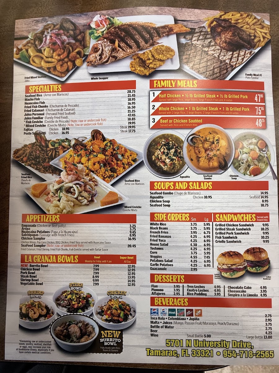 Welcome to La Granja - Tamarac, a vibrant eatery located at 5701 N University Dr, where every dish encapsulates the essence of Hispanic cooking. The menu features an enticing range of options—from hearty Seafood Rice to satisfying Fried Fish Chunks, and not to forget, the renowned chicken bowls that patrons rave about for their generous portions and delightful flavors.